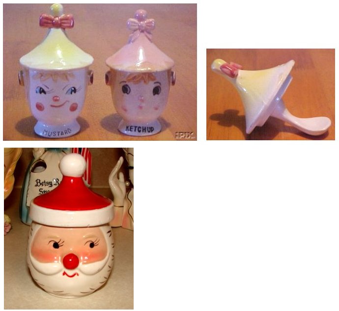 Instant Coffee, Mustard, Ketchup, Cocktail Olives, Cocktail Cherries, Relish, Sweetie Syrup, Salt & Pepper, and Santa/Mrs Santa pixie condiment. Lefton also made a cocktail set consisting of a small