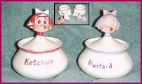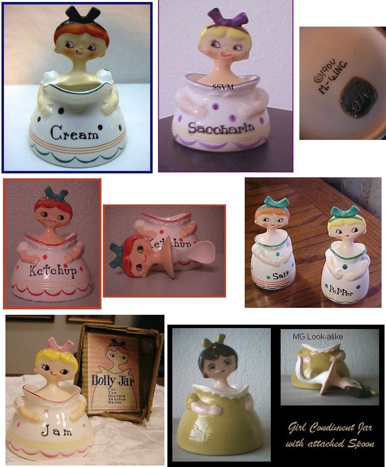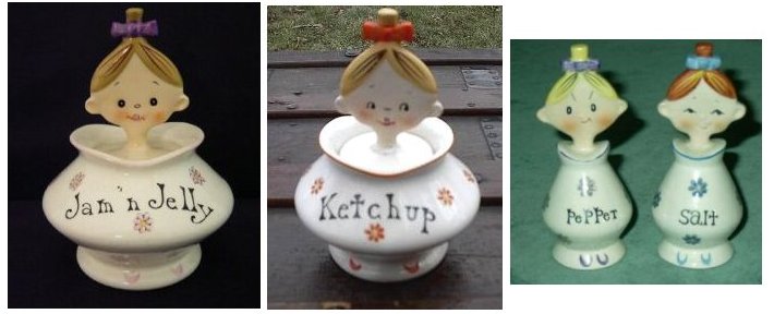 half the size of the other condiments. The most common flaw on these are the paint loss. The Dolly Girls came as: cream, sugar, mustard, ketchup, jam, relish, match holders, saccharin and salt/pepper
