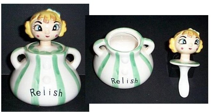 half the size of the other condiments. The most common flaw on these are the paint loss. The Dolly Girls came as: cream, sugar, mustard, ketchup, jam, relish, match holders, saccharin and salt/pepper