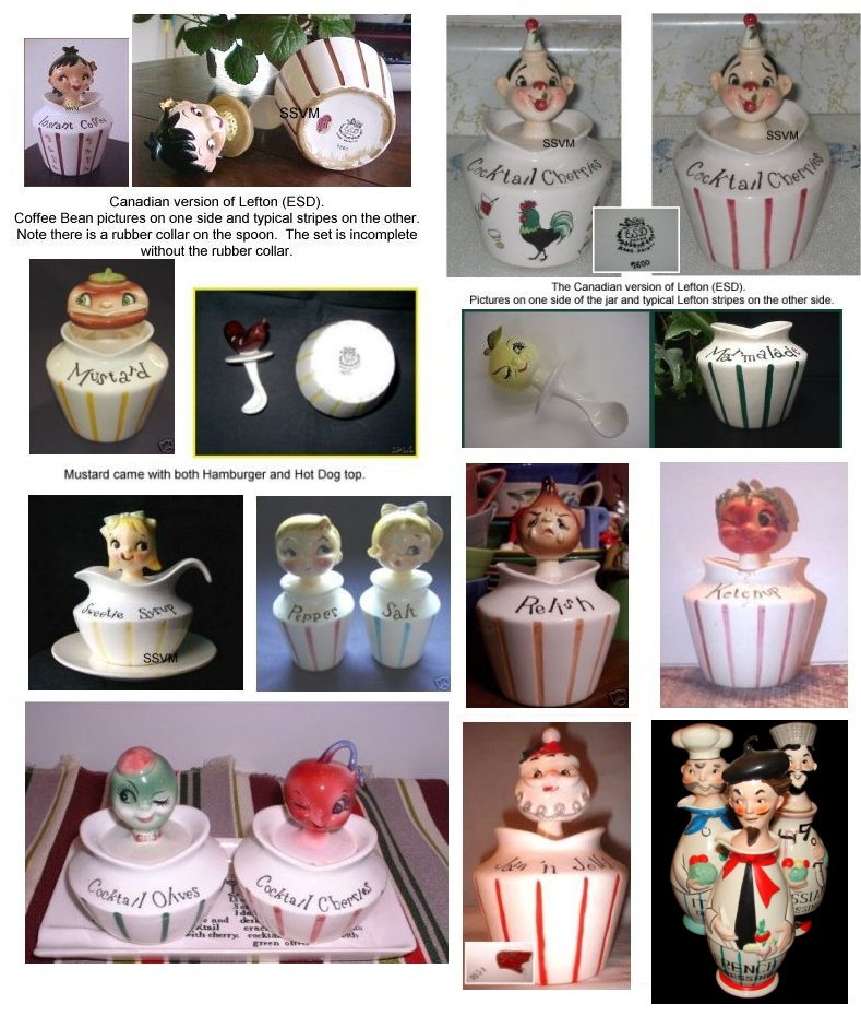 Instant Coffee, Mustard, Ketchup, Cocktail Olives, Cocktail Cherries, Relish, Sweetie Syrup, Salt & Pepper, and Santa/Mrs Santa pixie condiment. Lefton also made a cocktail set consisting of a small